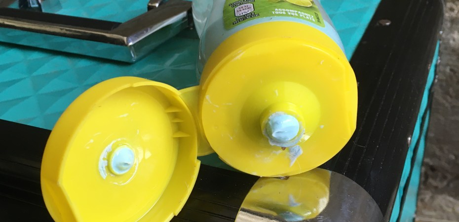 Mais le coté pratique n’était pas à 100 % : le contenant est trop petit (donc on le vide vite), le trou pour remplir pas assez large (donc on en met partout et on met de longues minutes à remplir), et l’utilisation est moyenne car on presse au milieu, il en reste au fond… Bref, j’ai tenu 2 saisons d’été, mais c’en fut trop !
