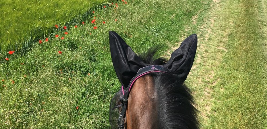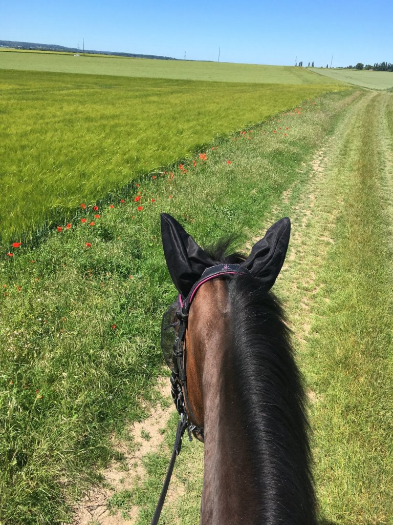 Donc la plupart du temps, mon « émerveillement » [oui carrément !!] se met en branle pendant une balade en solitaire ou lorsque je marche rênes longues en carrière. Des trucs franchement tous cons hein me direz-vous, mais comme je suis souvent rentrée chez moi dépitée parce que je n’avais pas réussi à partir en balade comme prévu, que j’avais passé 25 minutes à faire 10 mètres, pour au final devoir descendre, rageuse, je me réjouis chaque fois que je suis sereine et que Voïda m’offre une balade où je ne m’arrête pas tous les mètres, où elle fait preuve de courage, parce que je sais que c’est dur pour elle par exemple d’être devant un autre cheval. Dernièrement, je nous ai donc félicité d’avoir croisé sereinement des voitures en marche dans un endroit très exigu, d’être passée devant un oiseau piailleur invisible dans un champ d’épis de blé qui bougent avec le vent ou d’avoir fait plus de 2m devant ma collègue de balade et même trotté en tête, chose impossible jusqu’ici.