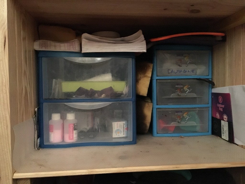 Le côté rangement est important, il faut en effet que cela soit pratique pour vous car en cas d’urgence vos devez savoir rapidement où trouver quoi. Après avoir eu une boite type curver [très vite été trop petite] j’ai opté pour des tiroirs en plastiques mis dans l’armoire. Pratiques, logeables, et si j’ai besoin de plusieurs choses, je prends uniquement le nécessaire dans un seau ou un petit pot de fromage blanc avec une anse.