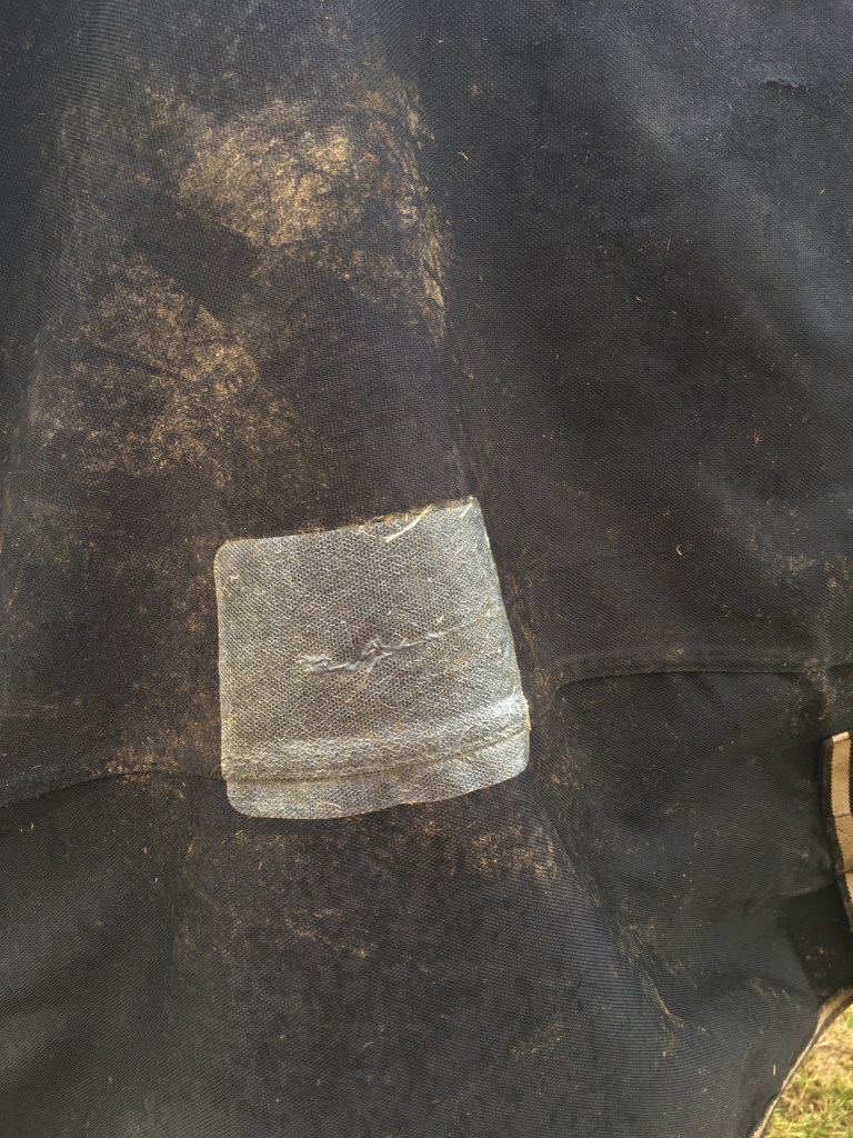 Résultat : une efficacité redoutable ! L’hydrofilm tient ses promesses aussi sur tissu : on l’applique aisément sur l’accroc ou le trou, on appuie bien pour le fixer et il ne bouge pas, malgré la pluie, le bac à sable, le bac à boue… [mon cheval n’aime pas trop se rouler dans la boue, mais il adore se rouler le reste du temps] et même la machine à laver !! et pour le décoller, il faut y aller.