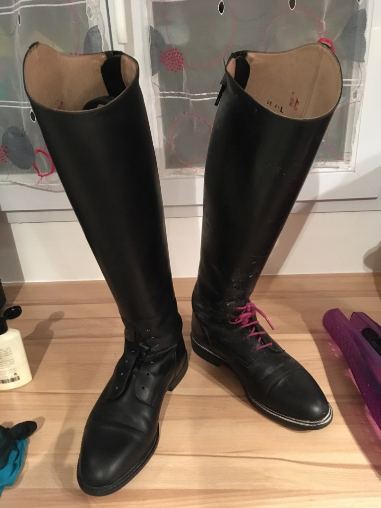 Avant l’été 2019, j’ai abandonné mon tradi combo mini-chaps et boots pour une paire de jolies bottes en cuir. C’est beau, ça galbe et t’as direct l’impression d’être Isabell Werth ! Mais contrairement aux mini-chaps avec lesquels on peut se permettre d’être un peu roots, les boots ne tolèrent [selon moi, ou ma maniaquerie des chaussures] aucune négligence en entretien.