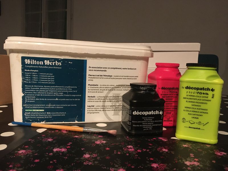 Galère de transporter les produits de soin de la sellerie à l’aire de pansage, ou au pré ! Pour le faciliter la vie, j’ai recyclé une boîte Hilton Herbs que j’ai customisée.