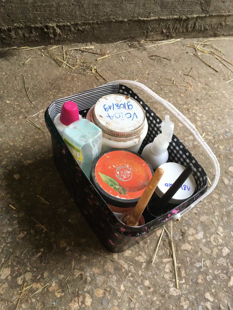 Ainsi j’ai tous les produits nécessaires au quotidien sous la main, sans risque que l’un d’eux coule dans ma jolie boîte de pansage !