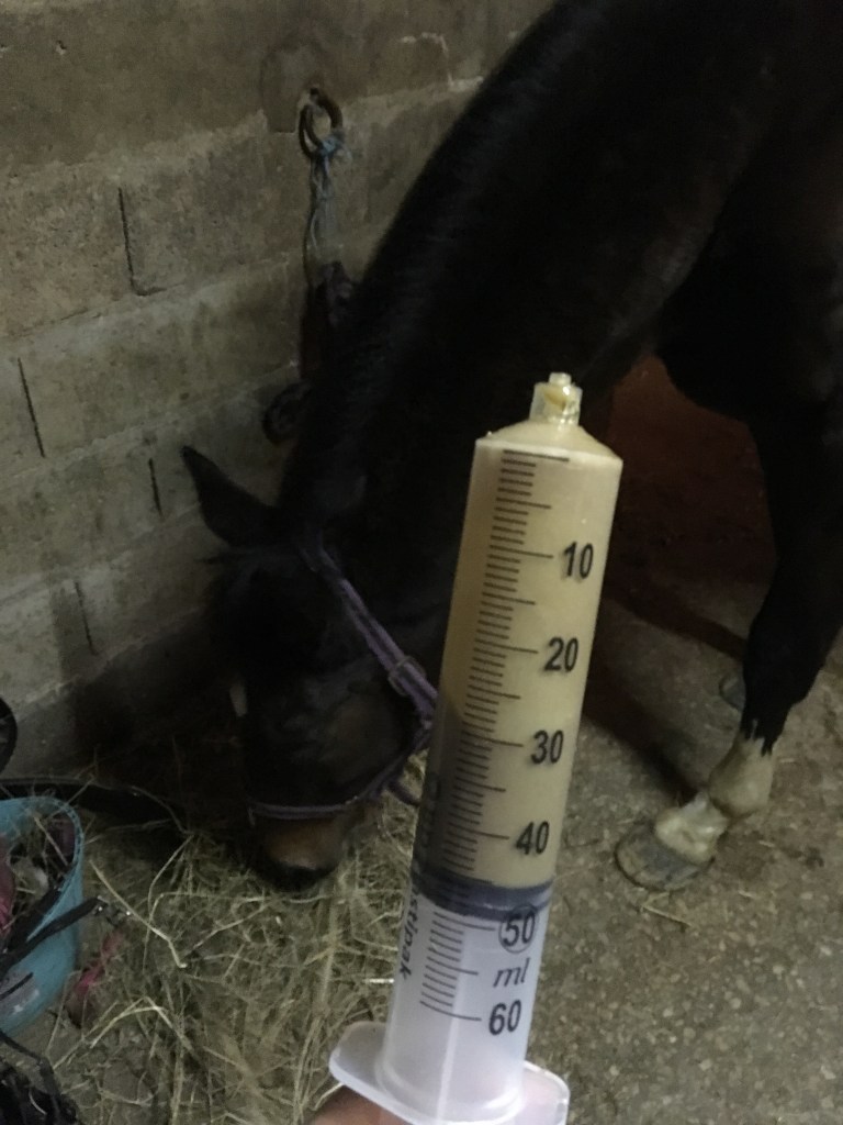 Il s’administre directement dans la bouche, il a une couleur peu ragoutante mais Voïda n’a pas refusé de le prendre. J’ai donc démarré la cure le 12 janvier 2018 et elle s’est terminée vers le 7 février, soit quand même moins d’un mois pourtant j’ai fait tout le flacon de 600ml à raison de 20ml/jour. Si au début j’ai été plutôt satisfaite car j’ai pu trotter même si elle montrait quelques signes de réticence, avant la fin de la cure vers fin janvier j’ai noté une dégradation. Elle s’est remise à taper dans le mur de son box (jarrets abîmés) et à se frotter au mur (couverture abîmée au niveau de la hanche/cuisse), signes de ses douleurs ovariennes. Pour Voïda, le produit n’a donc pas du tout d’effet sur le long terme.
