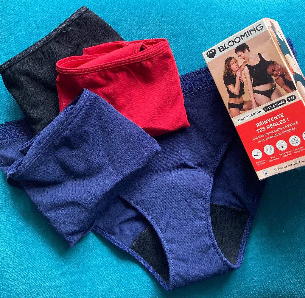 Sur les conseils de ma petite sœur, j’ai opté pour la marque de culottes menstruelles Blooming, marque française née en 2018. La plupart des marques proposent la même chose : des culottes simples déclinées en plusieurs formes et coloris basiques (noir, rouge, bleu) parfois des petits détails glamour, et surtout avec une couche absorbante efficace, fine et discrète. Shorty, culotte normale, taille haute, avec dentelle… chez Blooming en tout cas il y en a pour tous les goûts. La fabrication de la couche absorbante est faite en France, mais l’assemblage est fait en zone EUROMED [On ne peut pas forcément tout avoir…] Cependant si vous souhaitez, d’autres marques fabriquent complètement en France comme Lemahieu (culotte bio !), Réjeanne, Pourprée… L’autre marque très connue sur les réseaux sociaux Fempo ne fabrique pas non plus complètement en France. La marque Eve and Co propose quant à elle des culottes suivant l’importance du flux, ce qui peut être donc intéressant pour notre sport afin d’avoir une capacité d’absorption plus importante lors de la pratique. Je n’ai pas étudié toutes les marques loin de là, j’ai opté pour la simplicité [Blooming est vendu chez Auchan, donc j’y ai simplement pensé pendant les courses au rayon hygiène intime], et je crois l’une des moins chères du marché.