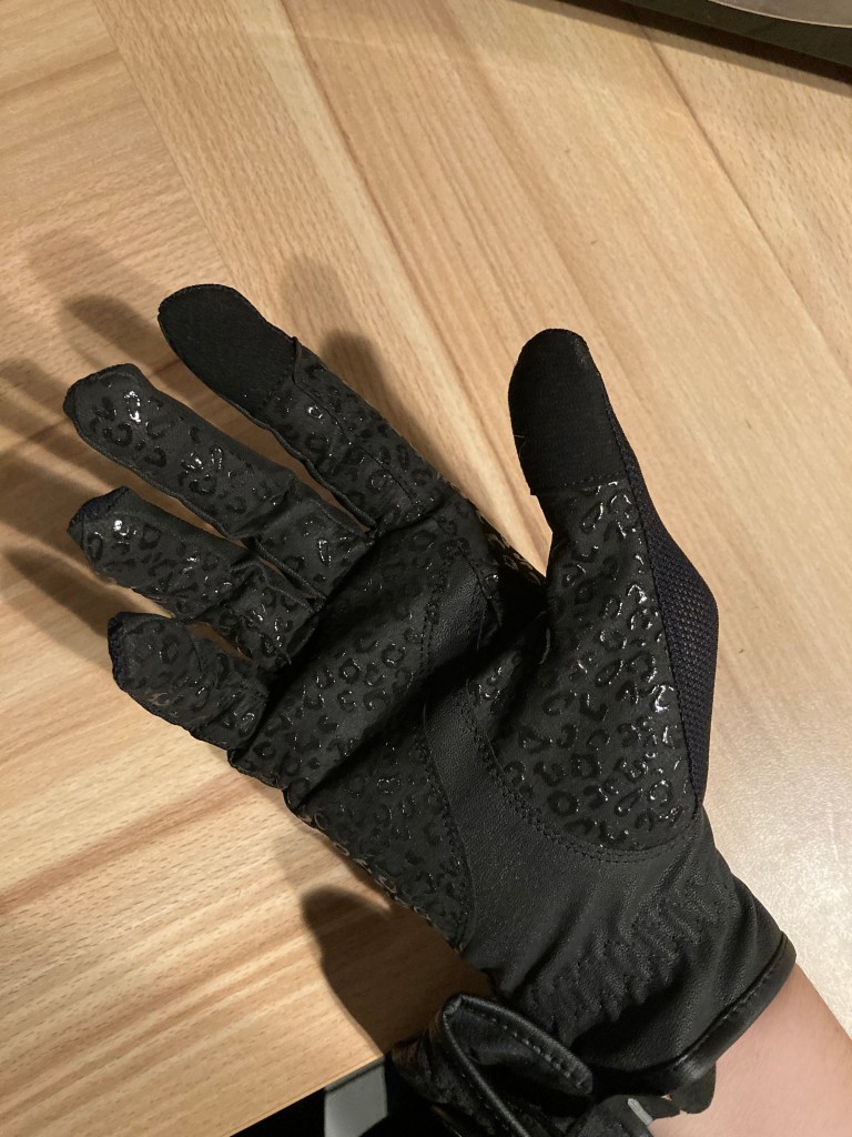 A réception de mes gants Hailey, je les trouve jolis, bien faits. Le grip a une forme de léopard, c’est amusant et original même si cela ne se voit pas beaucoup. Le tissu semble de qualité, le scratch et la création aussi. Je suis pas trop fan de ce type de tissu car ça s’abîme super vite dès qu’un scratch se colle dessus [et combien de trucs à scratch possède un cavalier ??!].