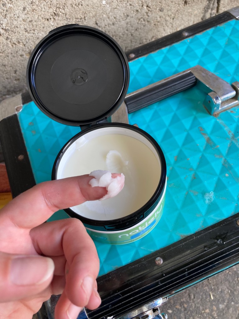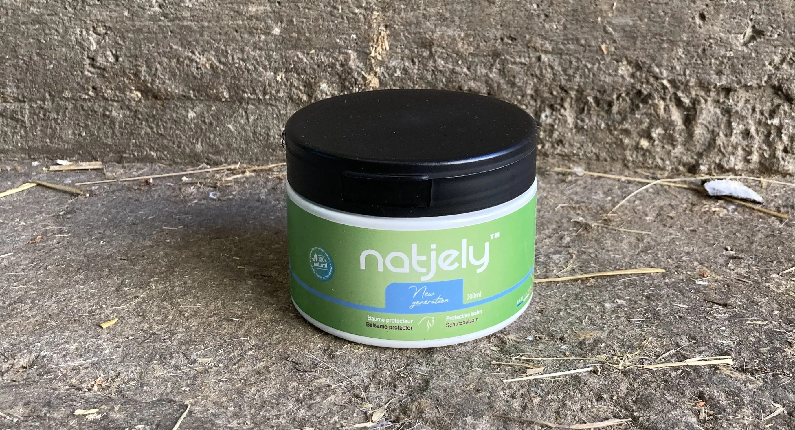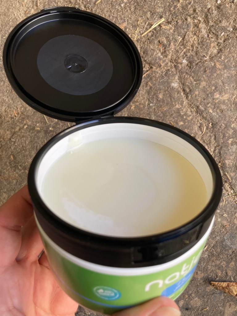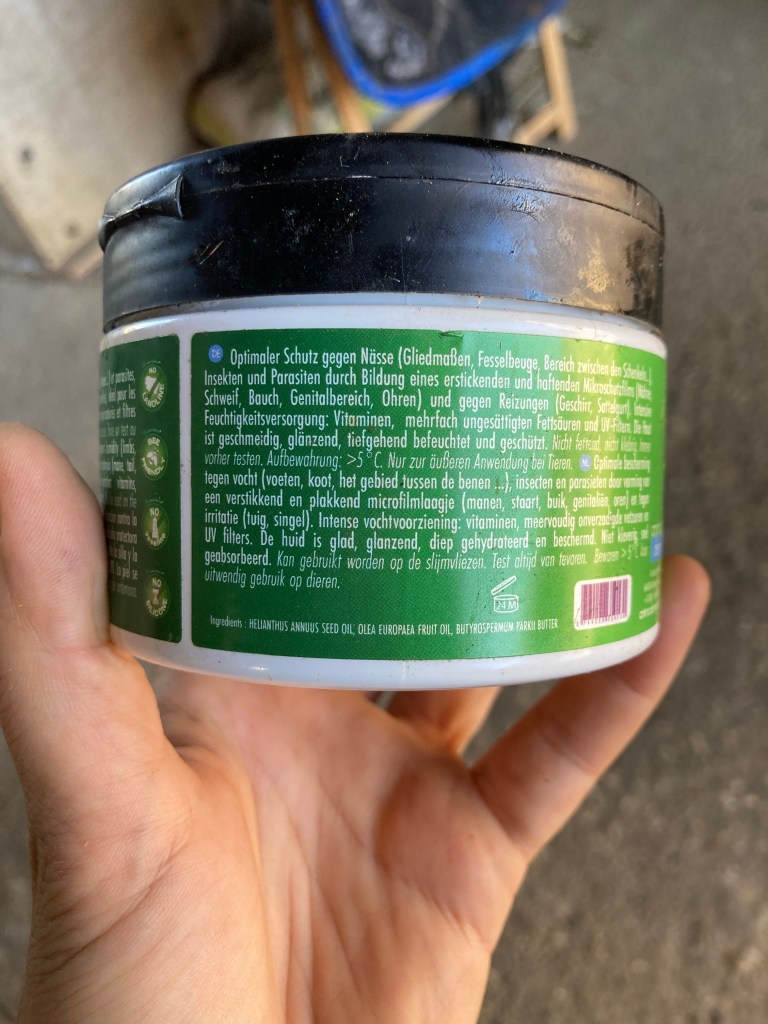 A l’ouverture, surprise, je trouve que cela ne sent strictement rien. OK, je n’ai pas un odorat super développé, mais pour un produit censé être anti-insectes, c’est étrange de n’avoir aucune odeur. En général ça sent quand même fort ces trucs-là ! Je ne sais pas vous mais j’adore ouvrir les pots neufs, car c’est toujours très lisse, très beau ! Packaging quant à lui super intéressant car le couvercle ne se visse pas, il se clipse et se déclipse, et reste accroché au pot. Pratique à ouvrir d’une seule main et pratique lorsqu’on passe en mettre au paddock/pré. Le format 300ml est aussi bien proportionné pour être rangé dans les boites de pansage.