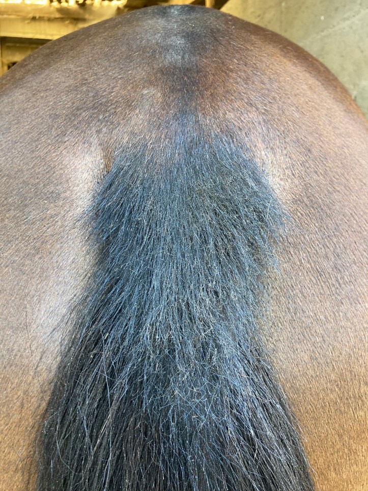Mon problème avec Voïda [enfin, un de mes problèmes…], c’est l’attaque des mouches sur la ligne ventrale proche des mamelles, qui provoque un grattage de queue l’été. (oui, pensez-y : un grattage de crinière ou de queue ne veut pas dire que les insectes piquent à cet endroit-là, les zones de grattages peuvent être le reflet de piqûres se faisant ailleurs sur le corps). Jusqu’ici, depuis plusieurs années, j’utilisais de la vaseline codex achetée en pharmacie à laquelle j’ajoutais un petit flacon d’huile essentielle de lavande aspic (voir article ici). Le souci est que la vaseline, c’est gras, très. gras, et c’est cracra ! Voïda en avait plein le bas de la queue, qui fouaille à cet endroit, ça salit les balzanes qui tapent le bide pour chasser ces p***** de mouches… Du coup, ma jument est crado… [déjà de base, pas une princesse super propre] Ci-contre, la queue de Voïda le 9 juillet (après application de Natjely pendant 10 jours environ)