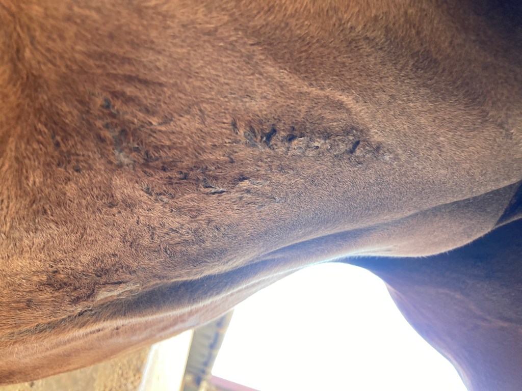 Parallèlement, j’utilisais le Natjely entre les antérieurs, car Voïda a toujours été attaquée par les insectes ici aussi et se tape violemment avec les sabots, elle a donc la peau un peu épaissie à cet endroit. Le résultat a été plutôt bon car cette peau à l’aspect « cartonné » s’est bien adoucie ! Je n’ai pas remarqué de problème de peau à cet endroit, la véto m’a dit que c’était justement parce que la peau de la ligne de ventre est bien plus fine.