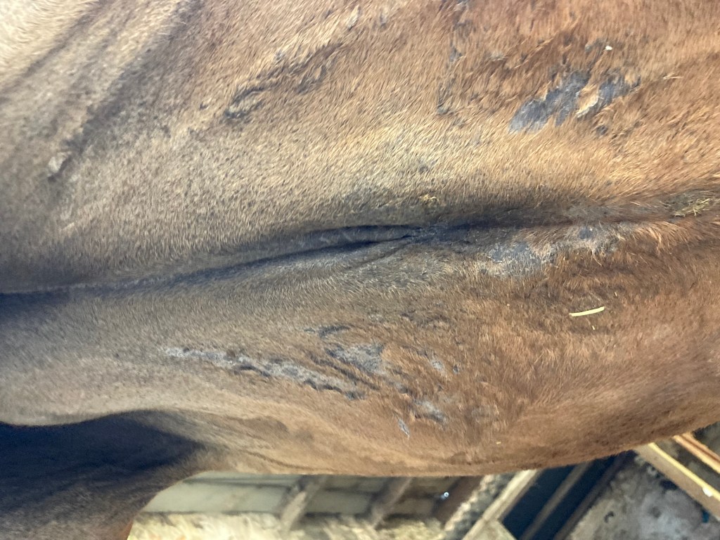 Mais en l’espace de 2 jours, cela s’empire clairement ! Les poils sont partis, la peau est craquelée et Voïda a très mal : elle ne laisse pas toucher du tout. La véto passe pour un autre cheval, je lui demande conseil, en lui parlant du produit, elle me confirme que c’est plus que certain que c’est une réaction à celui-ci. Je stoppe donc immédiatement sont utilisation, et j’applique du Crinequin pour aider à régénérer la peau et éviter les insectes.