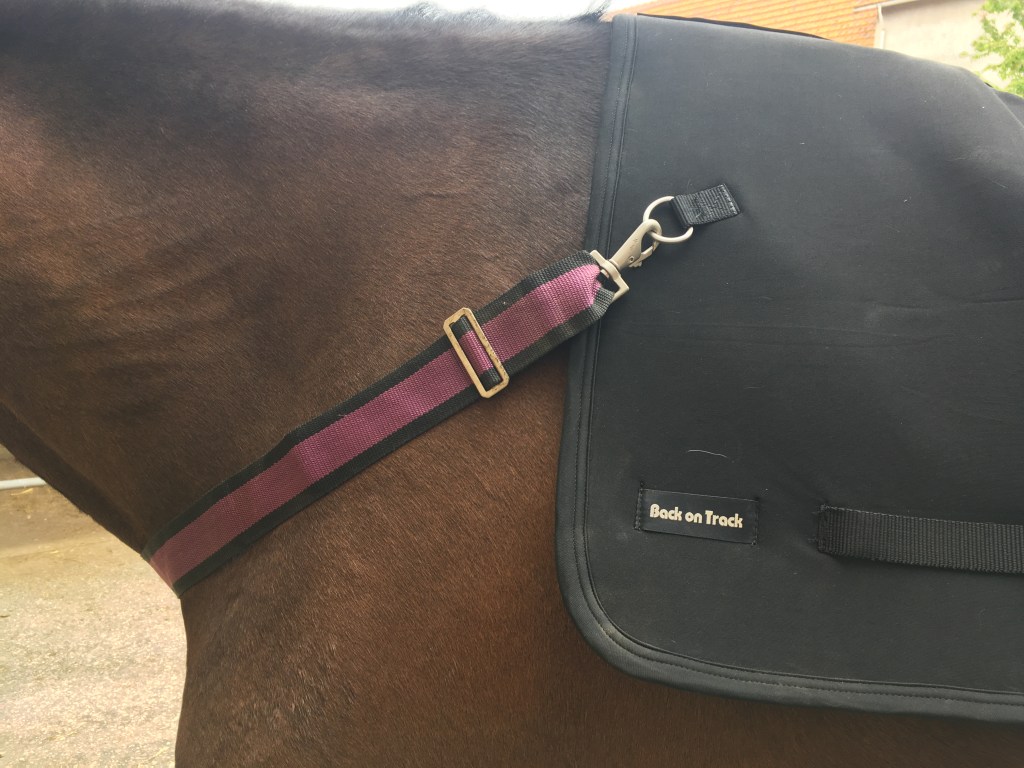 Mais passez vote chemin sur l’achat d’un collier Back On Track à plus de 30€ : j’ai fait la même chose avec une sangle de vieille couverture et le chauffe dos bouge quand même (un coup de vent ou le cheval qui bouge un peu et ni une ni deux il se retrouve avec un bavoir !). L’hiver je mets couvre-rein et tapis par-dessus pour les réchauffer avant de les poser ensuite sur son dos et du coup, ça permet qu’il reste mieux en place.