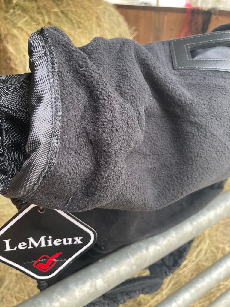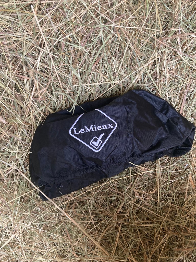 Mais tout a changé quand j’ai découvert la housse imperméable pour monter de chez LeMieux ! Il existe en effet des housses de rangement à effet imperméable, mais elles ne sont pas adaptées pour monter, alors que celle-ci, oui. Je vous détaille ci-dessous les spécificités de la housse de selle LeMieux Ride On :