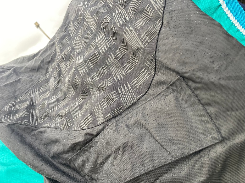 – un tissu extérieur imperméable avec des incrustations en silicone sur le siège pour éviter de glisser. Cela ne gêne pas non plus à l’inverse et ne nous scotche pas au siège.