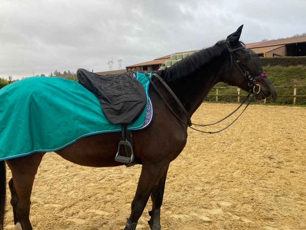 Je n’ai jamais vraiment aimé monter sous la pluie [les porteurs de lunettes me comprendront], mais cela ne me posait pas trop de problème jusqu’à ce que je subisse une mésaventure avec ma selle en cuir Eric Thomas toute neuve qui, après une douche en balade, s’est retrouvée littéralement verte sur les quartiers [quand je vous dis que j’ai toujours la poisse]. Après une petite bataille juridique, on me l’a échangée contre une Forestier et j’ai juré que JAMAIS elle ne verrait une goutte d’eau. Cette promesse s’est poursuivie quand j’ai eu en 2013 ma selle sur-mesure du sellier Gaffet, qui m’avait aussi dit qu’une selle n’était malheureusement pas vraiment faite pour être détrempée.