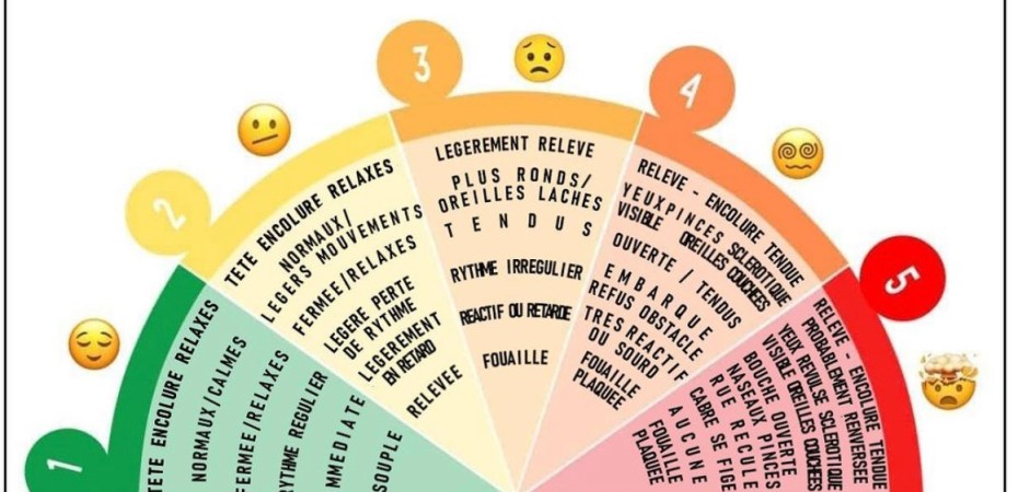 L’infographie d’Equimetric parle d’elle-même : il suffit de prendre la roue, lire les observables et les reconnaitre sur les chevaux. En fonction, on va pouvoir déterminer la zone de stress, de vert à rouge.