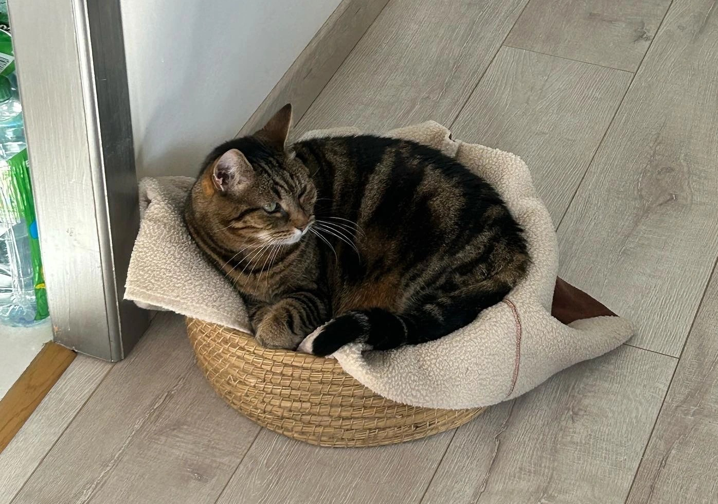 et pour la petite histoire, cette couverture fait plusieurs heureux : le chat l’a adoptée dès les premiers coups de ciseaux et depuis que j’ai mis la chute dans ce panier, c’est the place to be pour lui, son endroit fétiche pour dormir confortablement !