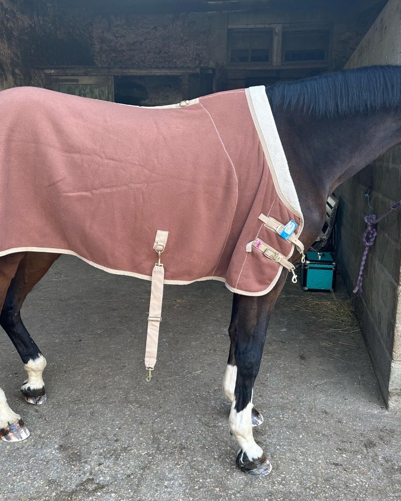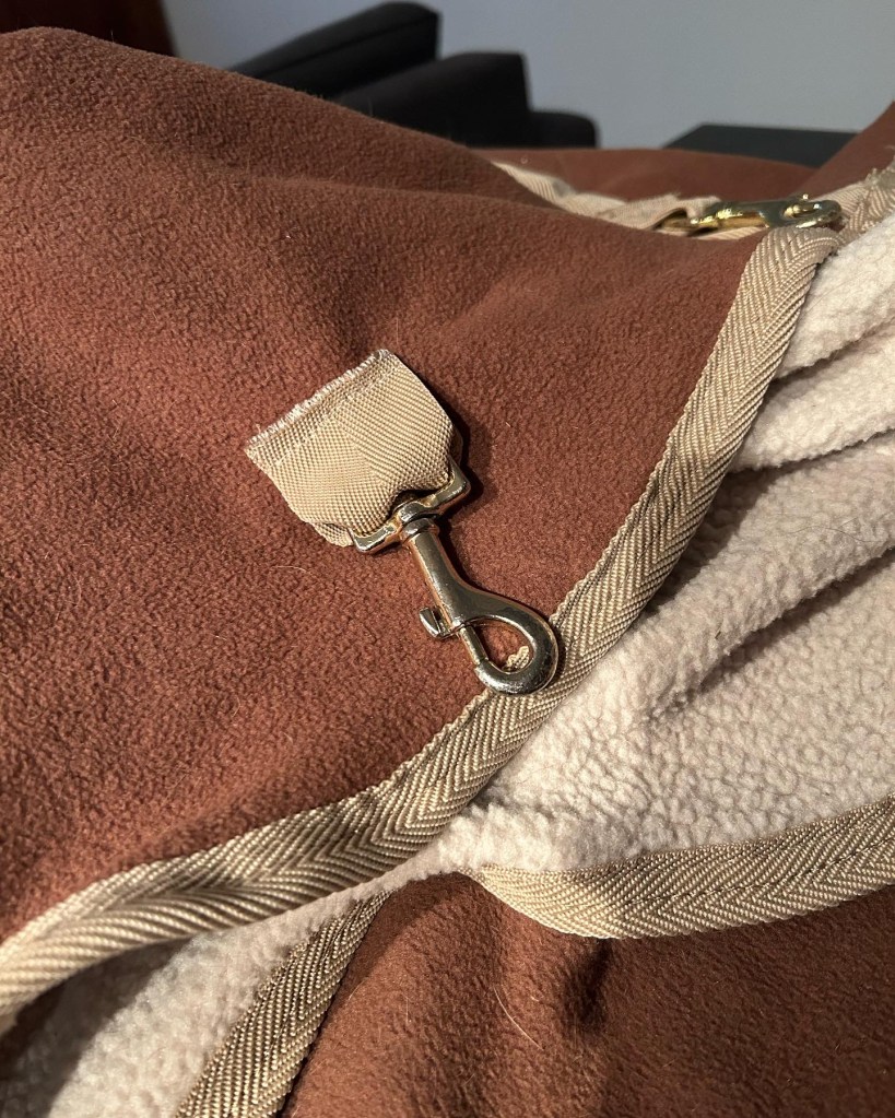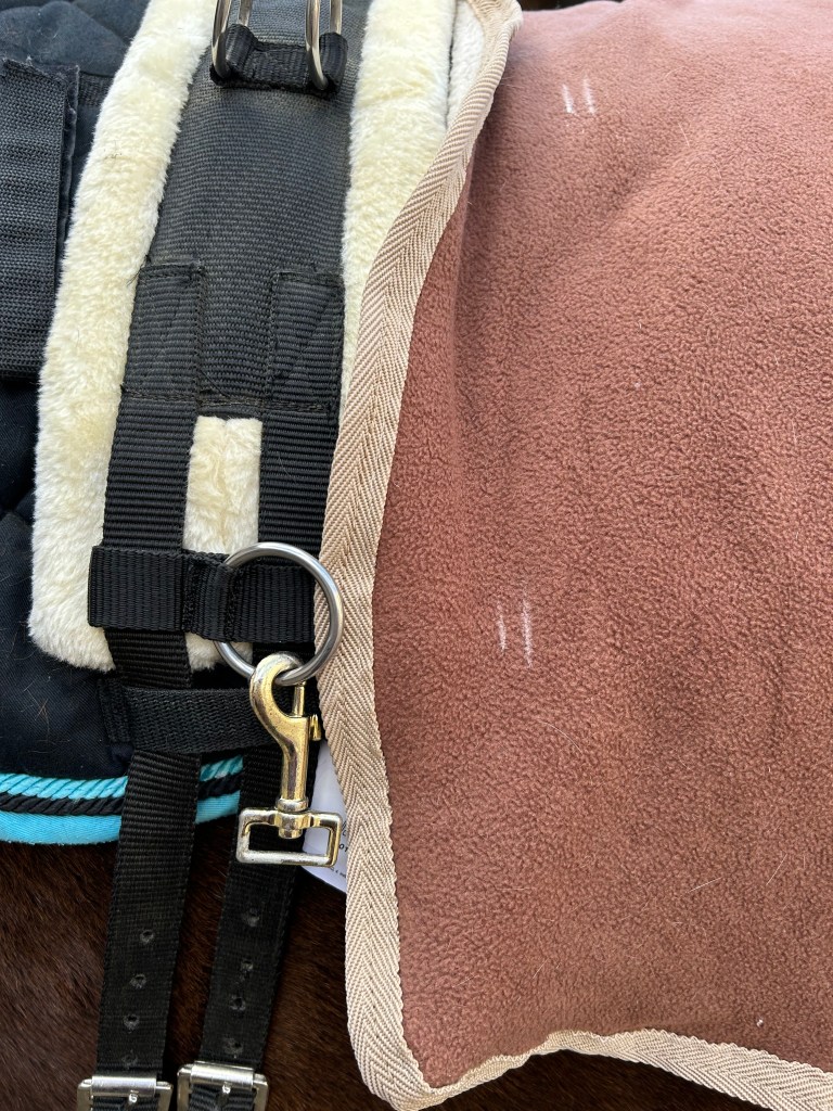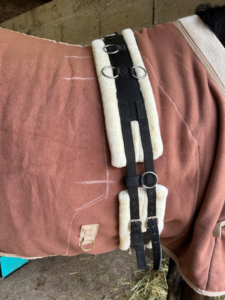 Tout d’abord, prenez les mesures sur votre cheval en plaçant la chemise sous votre surfaix installé. A l’aide d’une craie à tissu, marquez les endroits où il faudra couper le tissu (juste avant l’arrière du surfaix, pour mon cas j’ai voulu que le tissu puisse légèrement être coincé sous le surfaix pour ne pas faire de « trou » ) et les endroits où vous poserez les mousquetons (ce point pourra être refait ensuite, une fois la coupe réalisée). J’ai fait une découpe comme sur la chemise de marcheur [beaucoup plus grande !] afin d’éviter que le tissu se mette dans le surfaix à cet endroit-là, pour laisse plus de « souplesse ».