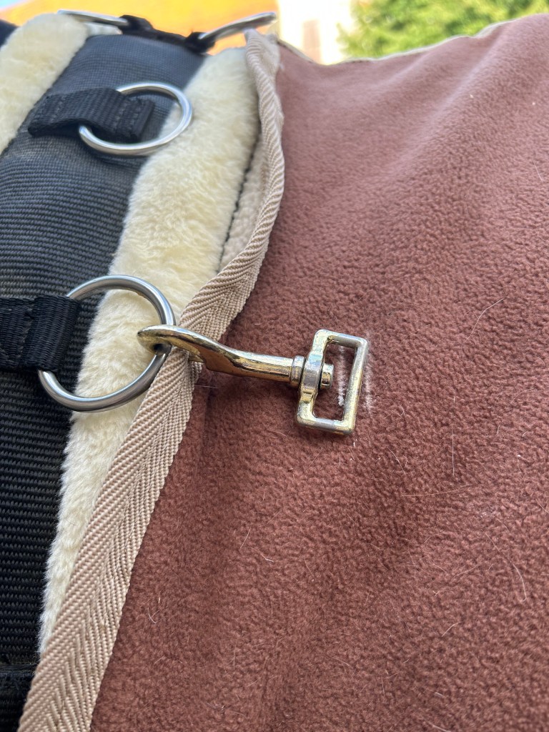 Pour la pose des mousquetons, j’ai récupéré la sangle de la chemise, qui est souple (il n’y avait qu’une sangle sous ventre). Vous pouvez certainement récupérer aussi sur une chemise classique.