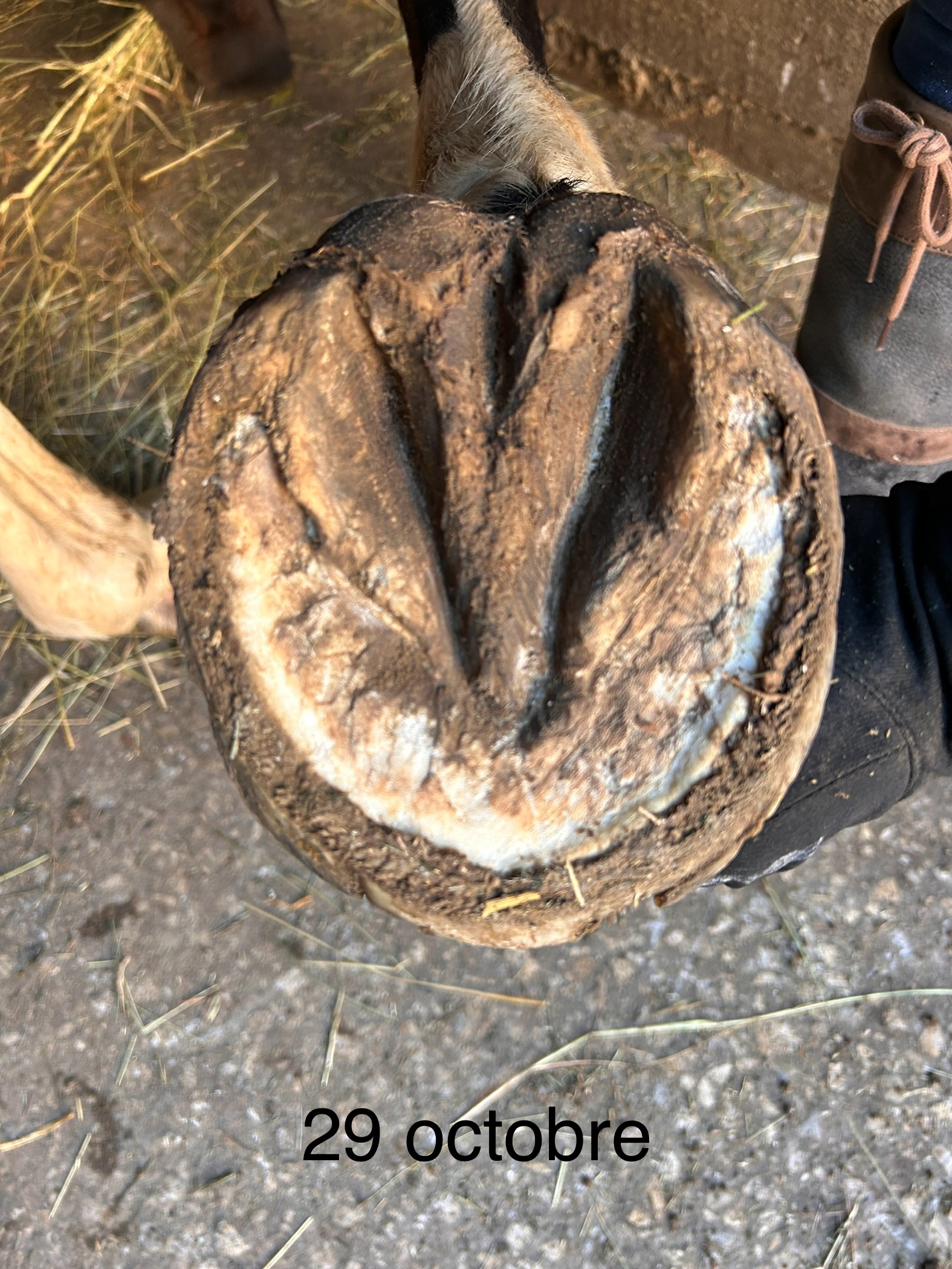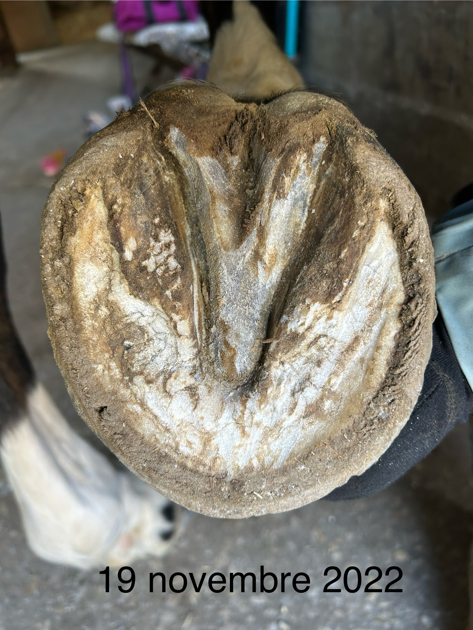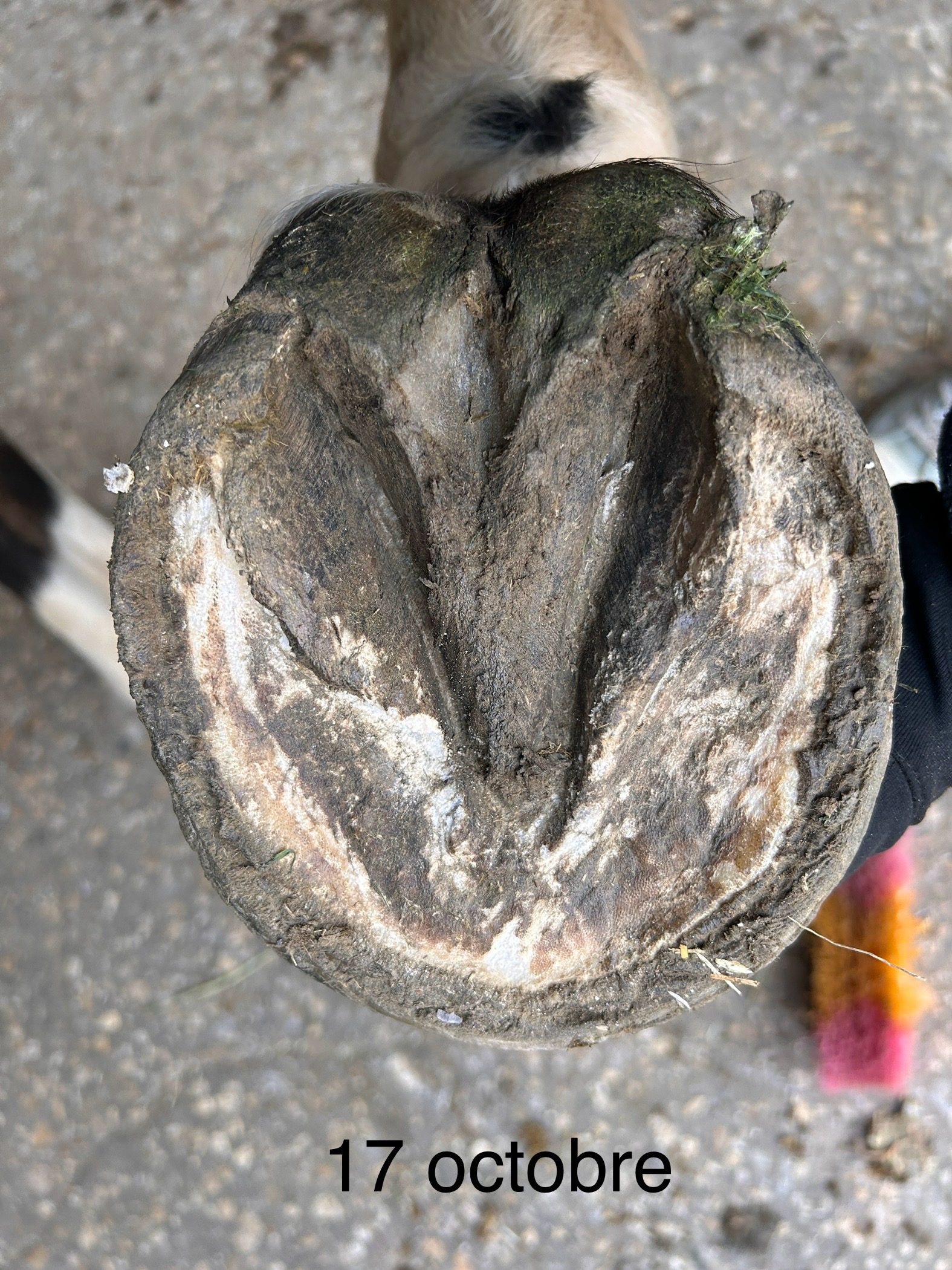 Chez Voïda, la bête noire, ce sont les pieds. Elle a une tendance à la pourriture de fourchettes déjà, dès qu’il fait un peu humide ou évidemment avec la vie au box malheureusement, et aussi le fait qu’elle soit pieds nus entraîne des trous causés par les petits cailloux notamment le long de la ligne blanche. En curatif ou en prévention, j’utilise donc notamment le soin entretien des fourchettes de la marque Cura Naturale.