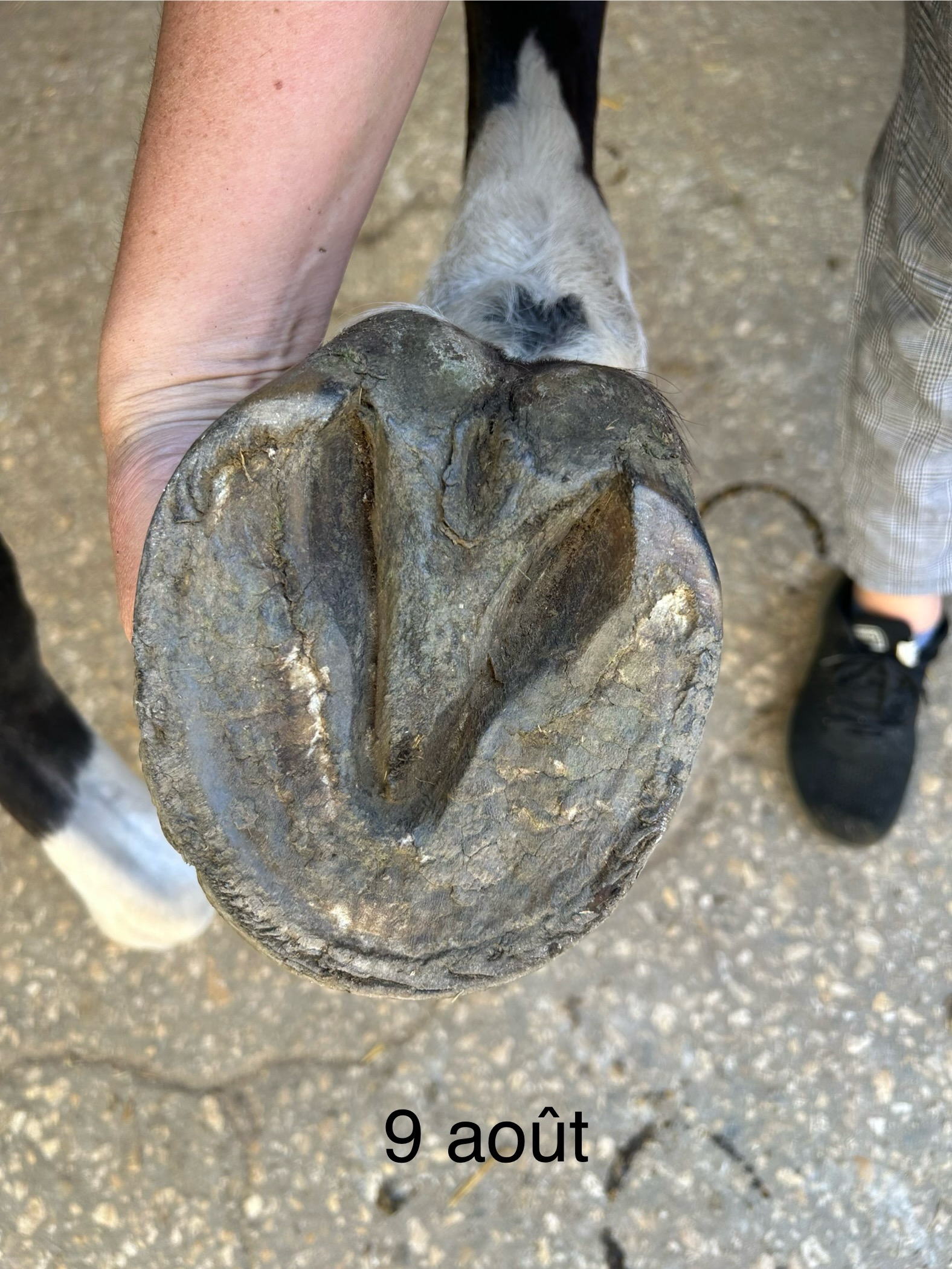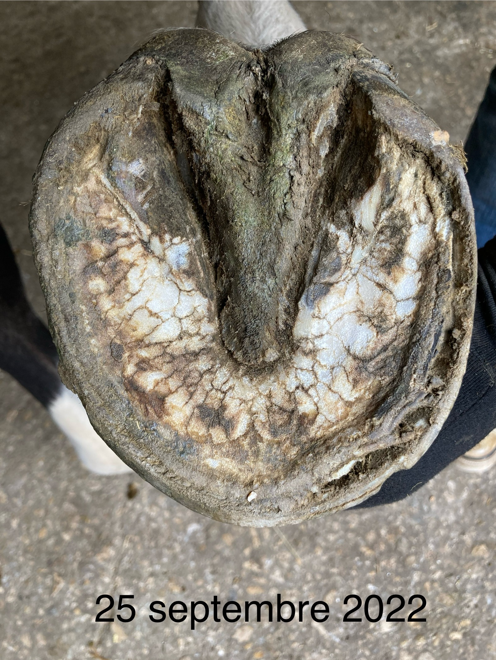 J’ai vu une réelle différence dans l’aspect des fourchettes de Voïda avec l’application de ce soin, que j’ai utilisé sur la période de septembre-octobre 2022 ainsi que sur la période août-octobre 2023. Vous pouvez voir ci-dessous la fréquence de pose suivant les mois (grâce à mon planner The Horse Riders) ainsi que les photos de l’évolution d’un pied sur cette période. A savoir que je combine parfois et alterne les soins que je pose sur les pieds en fonction des besoins : je peux ainsi utiliser en complément ou en alternance de l’huile de cade, de l’artimud, du hoof stuff, du vinaigre, de l’eau oxygénée ou du trush ender. L’avantage du soin entretien des fourchettes Cura Naturale, c’est sa texture qui permet je trouve de faire une barrière sur les zones fragiles ou fragilisées, et donc parfois que le soin mis en premier soit plus efficace aussi.