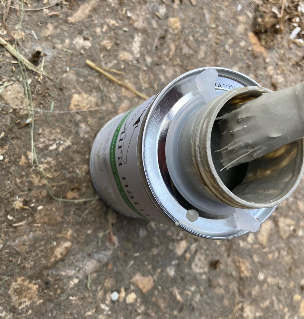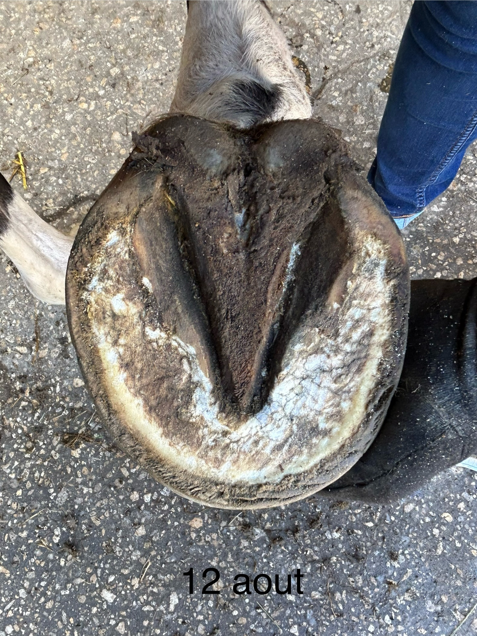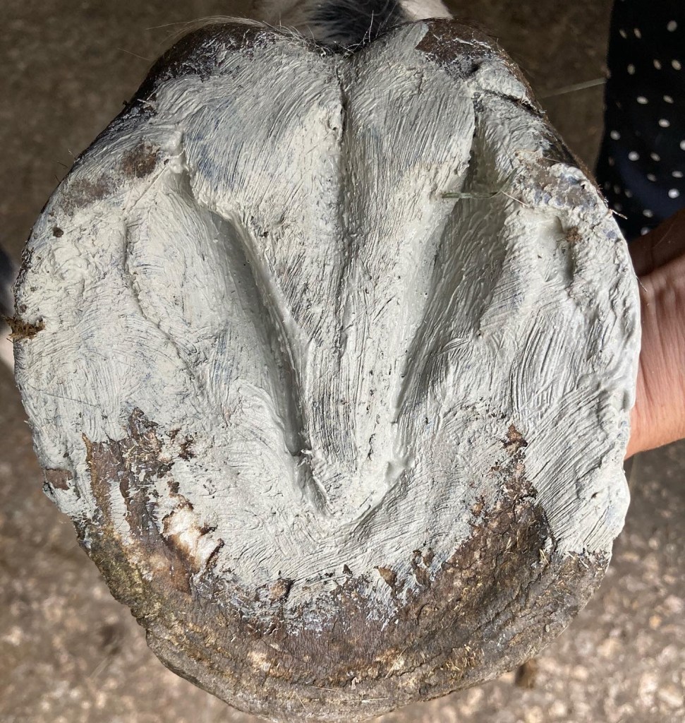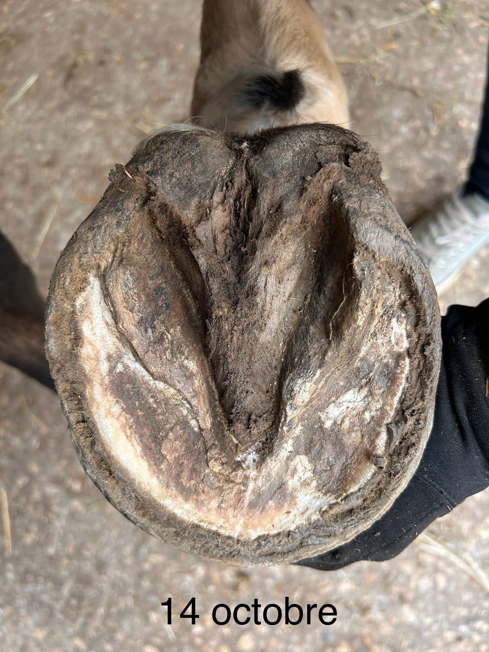 Je l’applique en général tous les trois jours en période humide et pluvieuse pour assurer à la fois le curatif et la prévention, et sinon occasionnellement quand le temps est sec et d’un coup pluvieux (en été par exemple). Je couvre toute la fourchette en insistant évidemment dans les lacunes, mais aussi la ligne blanche et les trous qui peuvent se trouver sur le contour de la sole afin de les assainir, ainsi que le longs des barres et parfois la sole. C’est assez surprenant à la première utilisation car le soin est liquide mais il se « solidifie » rapidement sur le pied, formant un « masque » d’argile. La marque préconise notamment de l’appliquer et de laisser le cheval sur sol sec pendant une quinzaine de minutes avant de le remettre au pré ou au box.