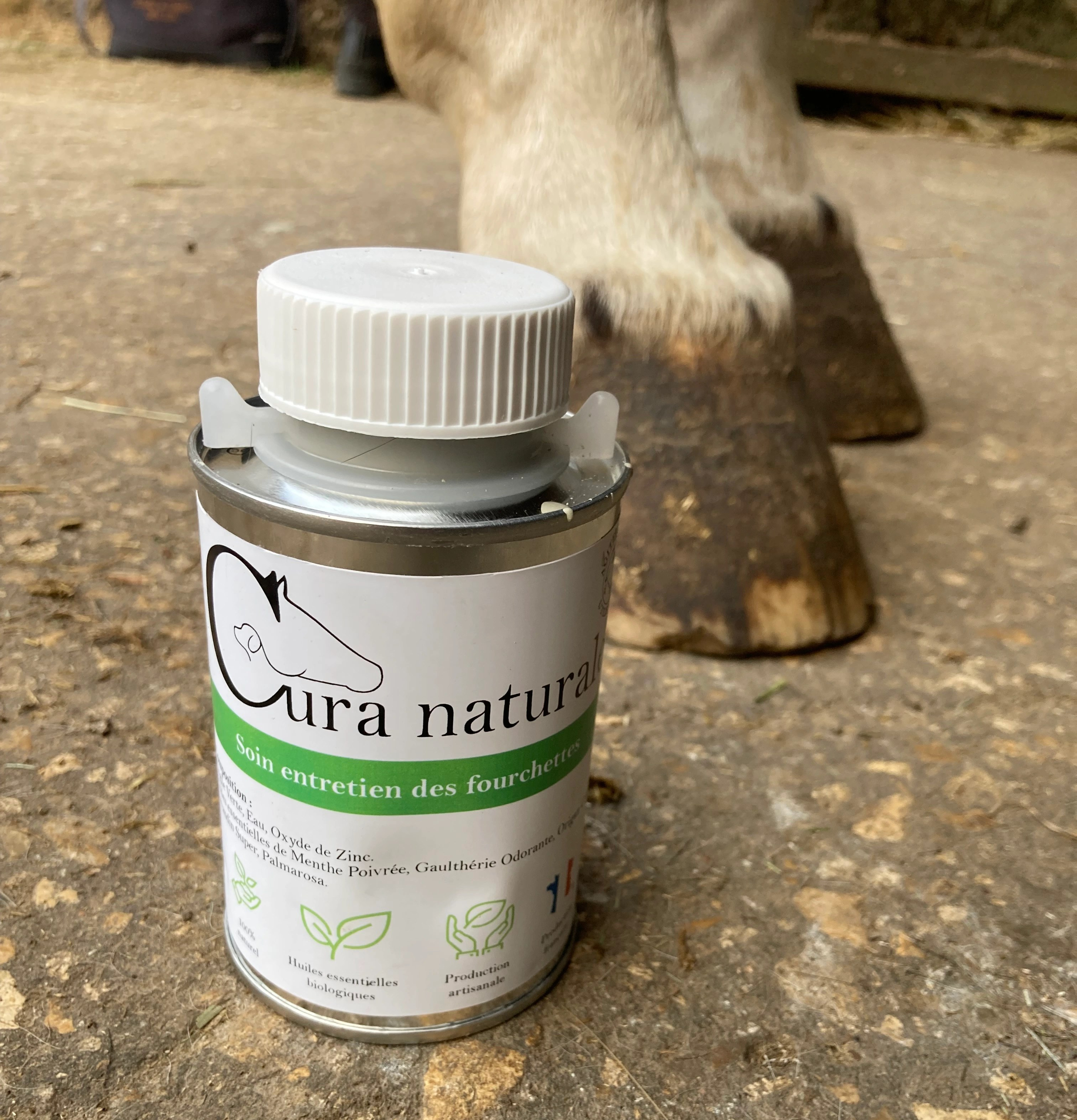 Selon le site marchand, le soin entretien des fourchettes Cura Naturale se compose d’argile verte, eau, oxyde de zinc, et d’huiles essentielles de géranium rosat, palmarosa, lavande fine, menthe poivrée. Il permet aussi bien de soigner que de prévenir une pourriture de fourchettes, une fourmilière, une seime ou encore un ramollissement du périople, de la sole et des glomes. Ce soin évite la dégradation de la face solaire (le dessous des pieds) en arrêtant le développement des germes. Il préserve la bonne santé des sabots tout au long de l’année et plus particulièrement lorsque les chevaux vivent dans un environnement humide (terrains détrempés ou boueux, litière souillée).